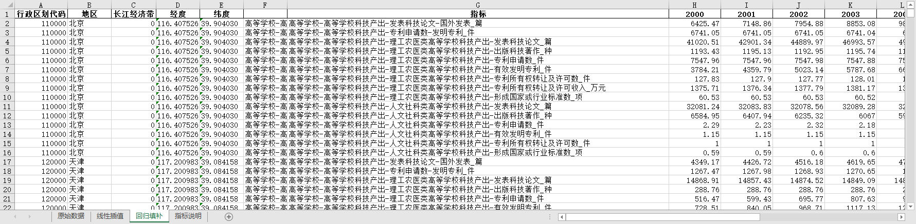 excel数据文件包原始数据(由于多年度指标不同存在缺失值)、线性插值、ARIMA填补三个版本,提供您参考使用。