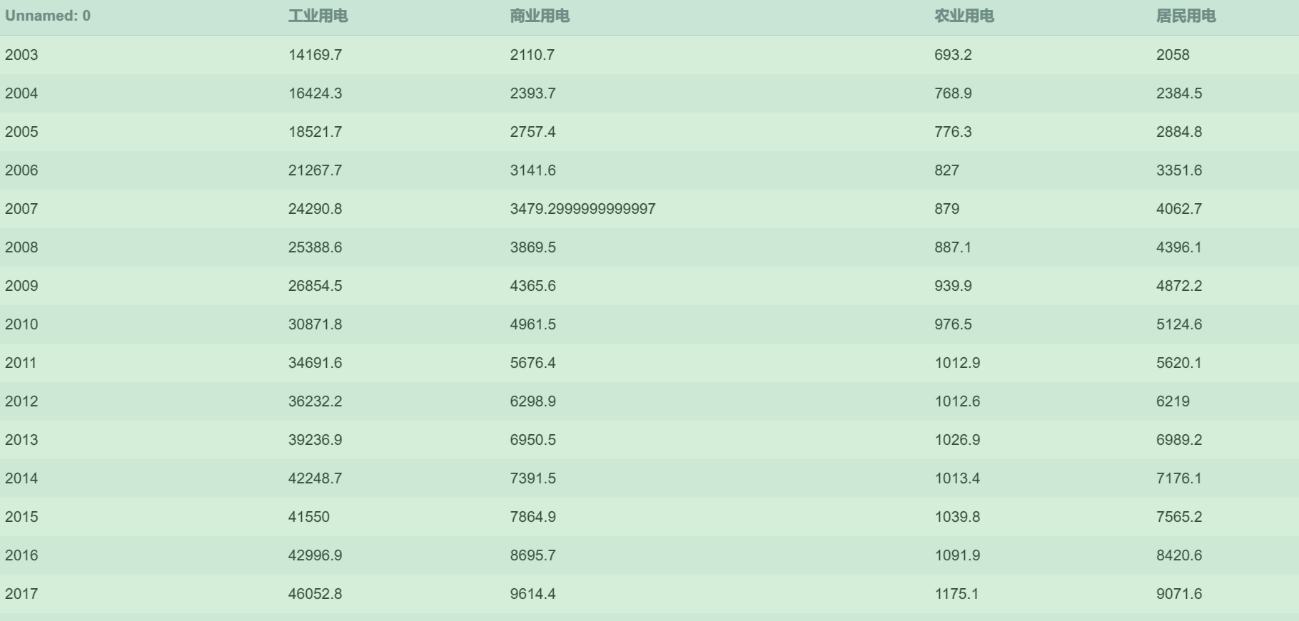 数据共有5列,第一列为时间列,表示数据的年份,其他四列分别为工业用电、商业用电、农业用电以及居民用电, 数据单位为“亿千瓦时”。