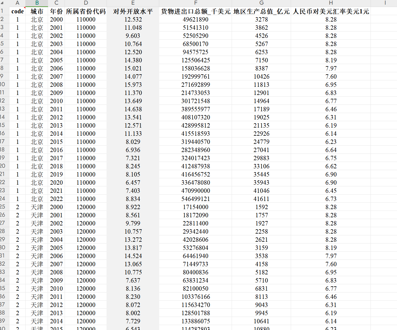 2000-2022年对外开放程度:code、城市、年份、所属省份代码、对外开放水平、货物进出口总额千美元、地区生产总值亿元、人民币对美元汇率美元1元。