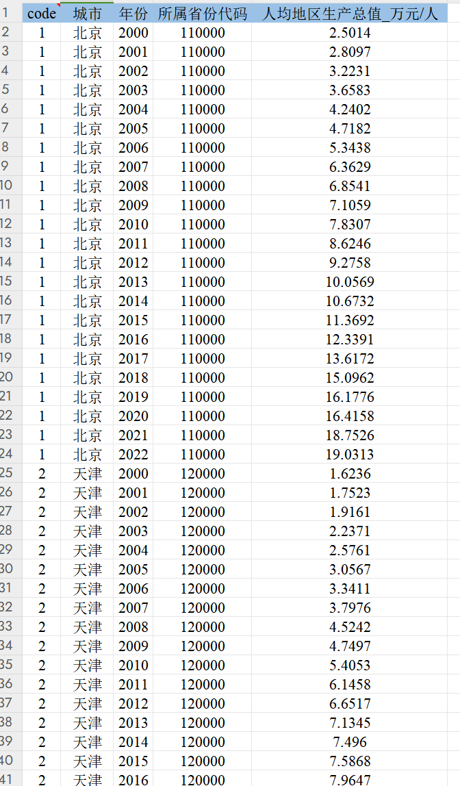 2000-2022年经济发展水平:code、城市、年份、所属省份代码、人均地区生产总值_万元/人。