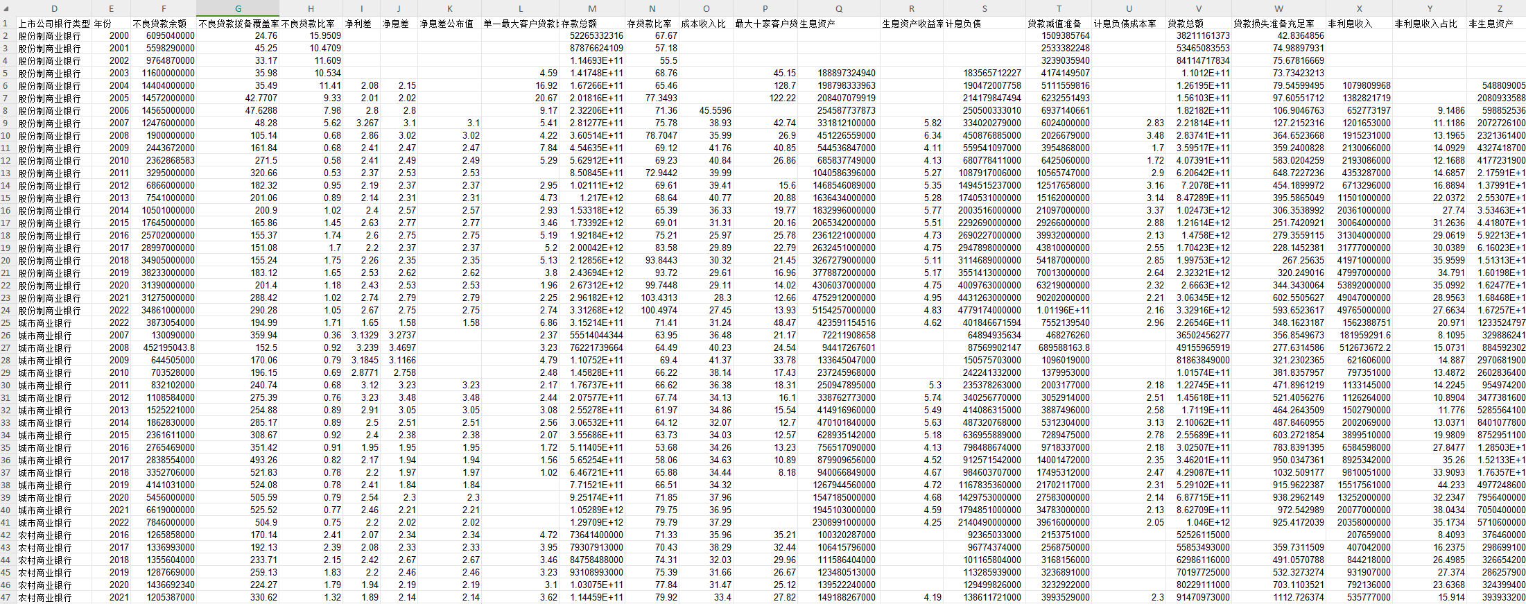 证券代码、证券简称、上市日期、上市公司银行类型、年份、不良贷款余额 、不良贷款拨备覆盖率、不良贷款比率、净利差、净息差、净息差公布值 、单一最大客户贷款比例、存款总额、存贷款比率、成本收入比、最大十家客户贷款占资本净额比例、生息资产、生息资产收益率、计息负债、贷款减值准备、计息负债成本率、贷款总额、贷款损失准备充足率、非利息收入 非利息收入占比、非生息资产、非计息负债、加权风险资产净额、库存现金 拨贷比、无息负债、杠杆率、核心资本充足率、核心资本净额、流动性覆盖率、生息资产平均余额、计息负债平均余额、资本充足率、银行理财产品余额、资本净额、一级资本充足率2013、一级资本净额2013 信用风险加权资产2013、加权风险资产净额2013、市场风险加权资产2013、操作风险加权资产2013、核心一级资本净额2013、核心一级资本充足率2013、资本充足率2013、资本净额2013。