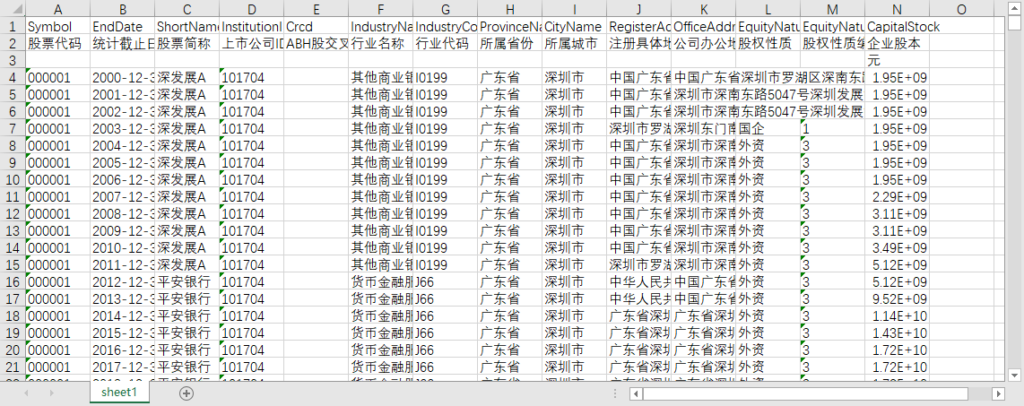 股票代码 统计截止日期 股票简称 上市公司ID ABH股交叉码 行业名称 行业代码 所属省份 所属城市 注册具体地址 公司办公地址 股权性质 股权性质编码 企业股本