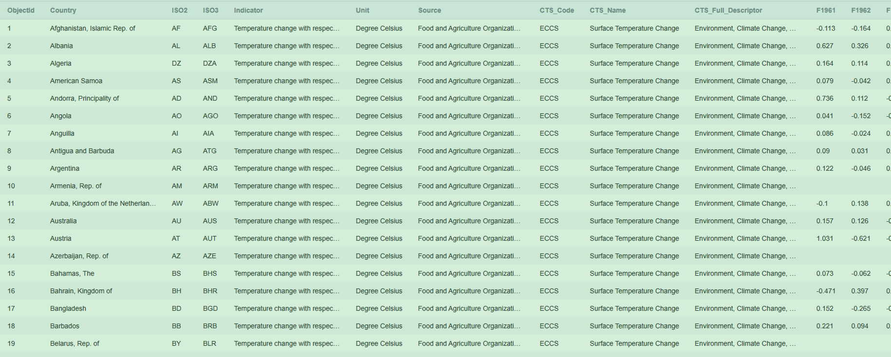 该数据集包含不同国家的气候变化指标及其相关代码(ISO2和ISO3)。从1961年起,该测量每年更新一次,直到2022年。