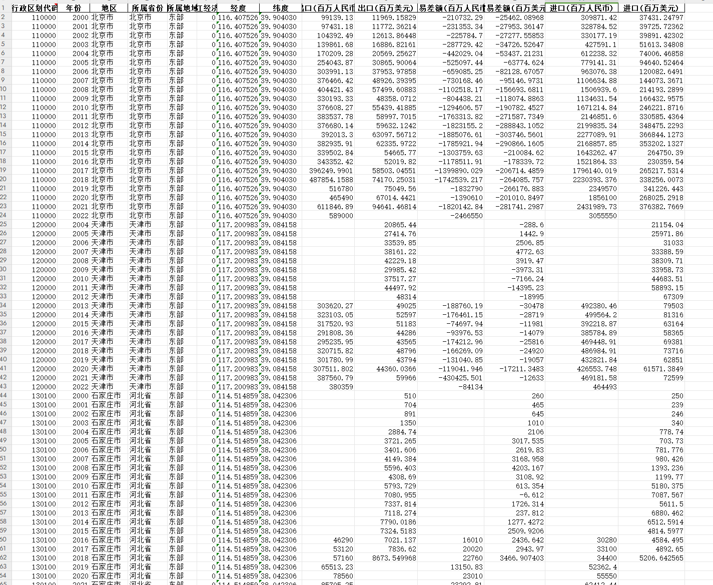 行政区划代码、年份、地区、所属省份、所属地域、长江经济带、经度、纬度、出口(百万人民币) 、出口(百万美元)、贸易差额(百万人民币)、贸易差额(百万美元)、进口(百万人民币)、进口(百万美元)