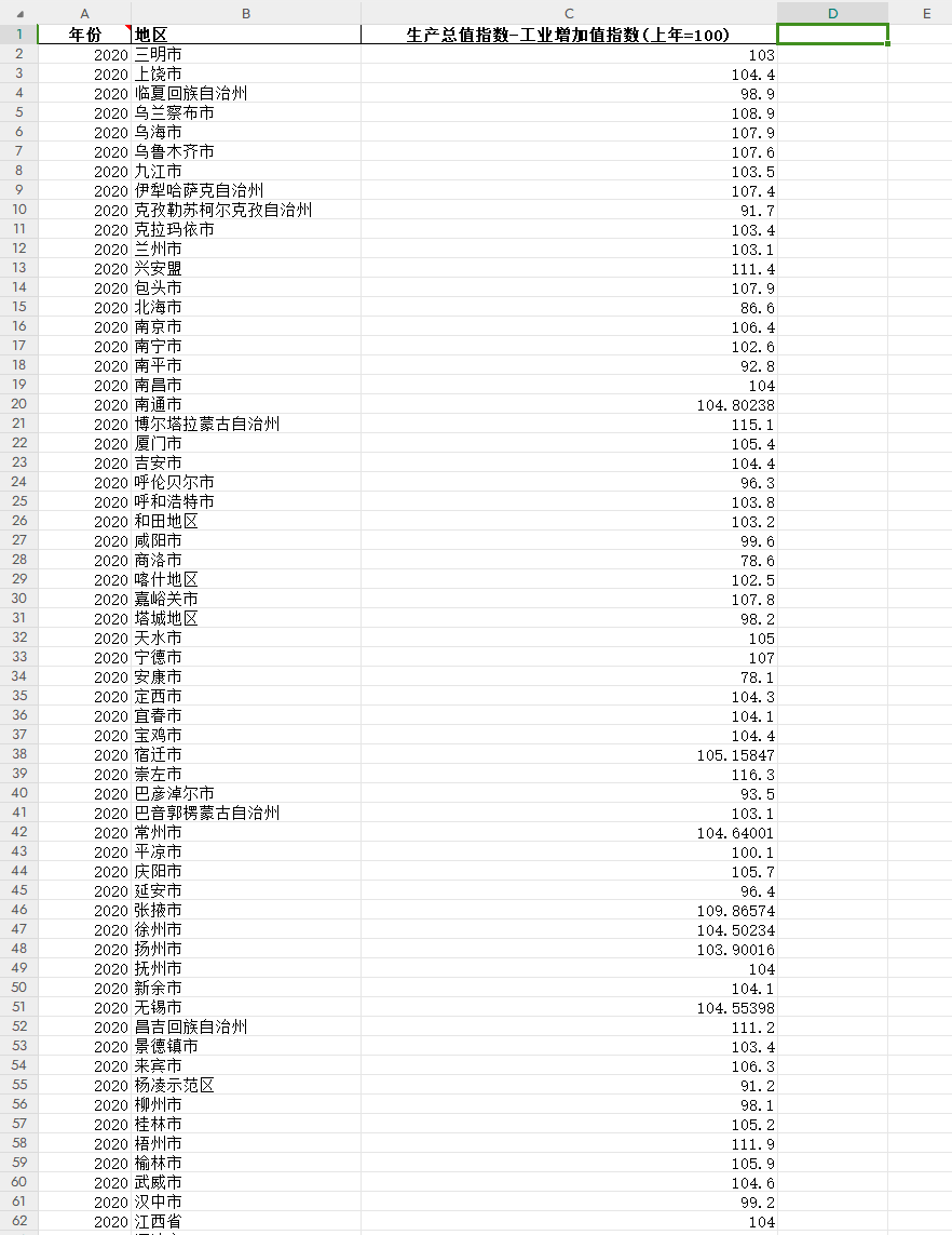 年份、地区、生产总值指数-工业增加值指数(上年=100)。