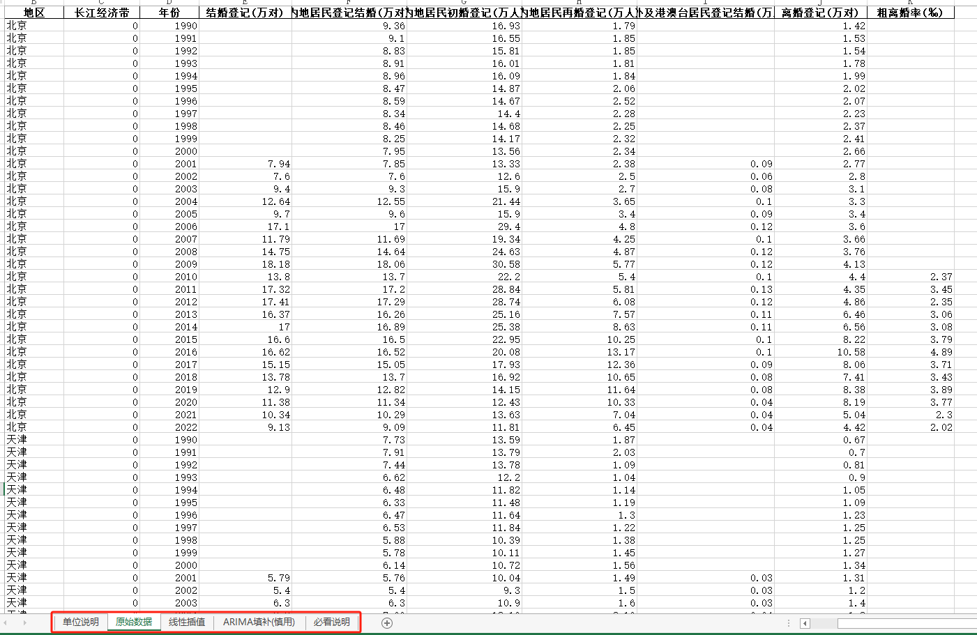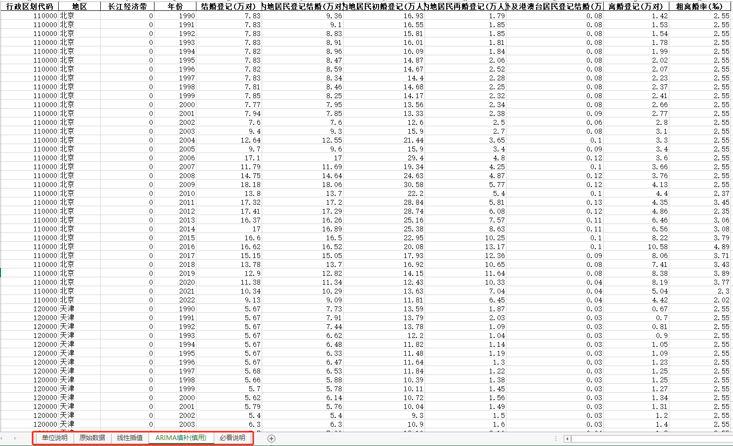 1990-2023年全国31省自治州直辖市未婚结婚初婚再婚离婚登记离婚率数据ARIMA填补无缺失