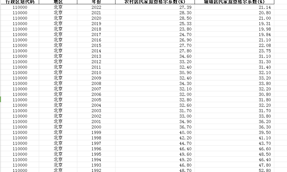 1978-2022年各省家庭恩格尔系数(分城镇、农村)/省城镇恩格尔系数、农村恩格尔系数