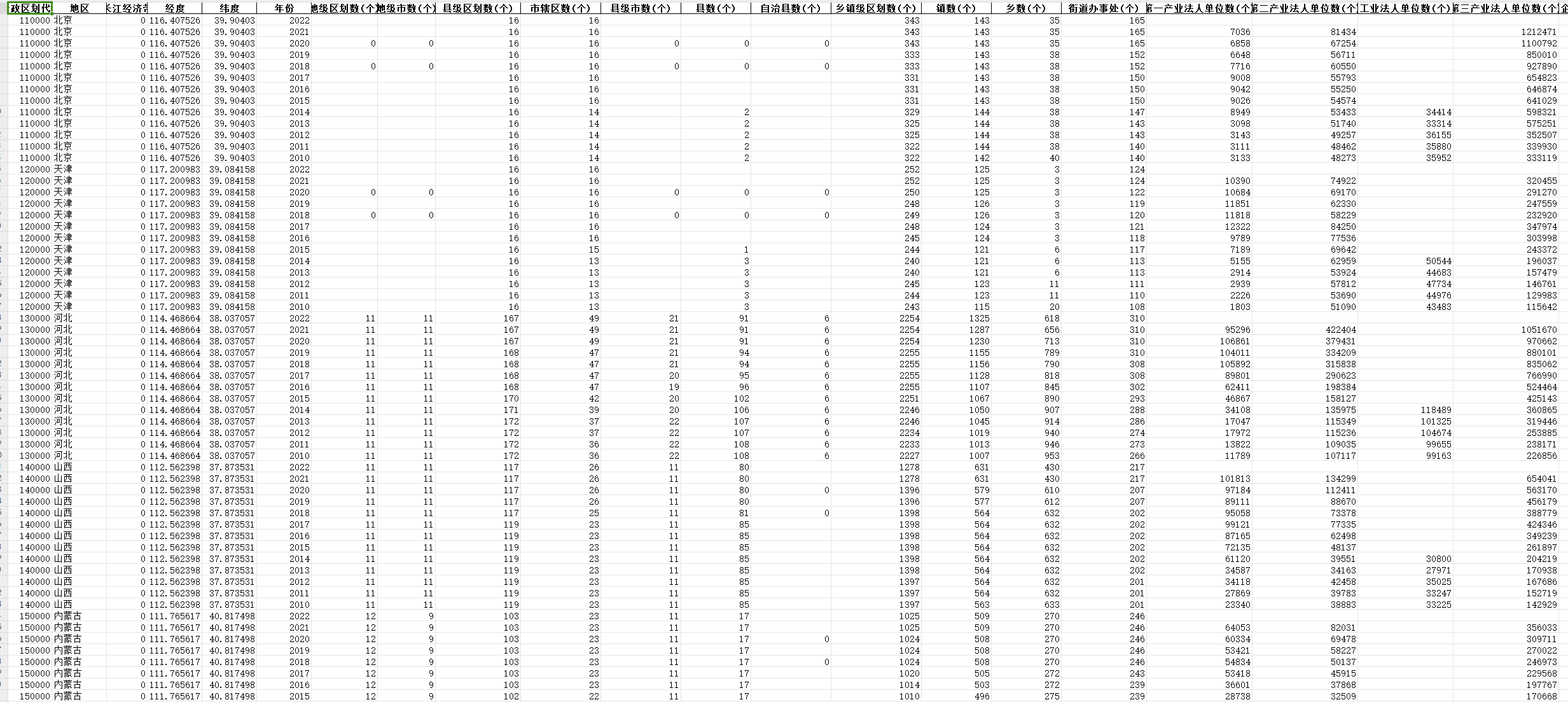名称、单位、指标解释、行政区划代码、地区、长江经济带、经度、纬度、年份、地级区划数(个)、 地级市数(个)、县级区划数(个)、市辖区数(个)、县级市数(个)、县数(个)、 自治县数(个)、乡镇级区划数(个)、镇数(个)、乡数(个)、街道办事处(个)、 第一产业法人单位数(个)、第二产业法人单位数(个)、工业法人单位数(个)、第三产业法人单位数(个)、企业法人单位数(个)、事业法人单位数(个)、机关法人单位数(个)、社会团体法人单位数(个)、其他类型机构法人单位数(个)、法人单位数(个)、农、林、牧、渔业法人单位数(个)、采矿业法人单位数(个)、制造业法人单位数(个)、电力、热力、燃气及水生产和供应业法人单位数(个)、建筑业法人单位数(个)、交通运输、仓储和邮政业法人单位数(个)、信息传输、软件和信息技术服务业法人单位数(个)、批发和零售业法人单位数(个)、住宿和餐饮业法人单位数(个) 、金融业法人单位数(个)、房地产业法人单位数(个)、租赁和商务服务业法人单位数(个)、科学研究和技术服务业法人单位数(个)、水利、环境和公共设施管理业法人单位数(个)、居民服务、修理和其他服务业法人单位数(个) 、教育业法人单位数(个) 卫生和社会工作法人单位数(个) 文化、体育和娱乐业法人单位数(个) 公共管理、社会保障和社会组织法人单位数(个)、国际组织业法人单位数(个)、国有控股企业法人单位数(个)、集体控股企业法人单位数(个)、私人控股企业法人单位数(个)、港、澳、台商控股企业法人单位数(个)、外商控股企业法人单位数(个)、其他企业法人单位数(个)、内资企业法人单位数(个)、国有企业法人单位数(个)、集体企业法人单位数(个)、股份合作企业法人单位数(个)、联营企业法人单位数(个)、有限责任公司法人单位数(个)、股份有限公司法人单位数(个)、私营企业法人单位数(个)、港、澳、台商投资企业法人单位数(个)、外商投资企业单位法人单位数(个)