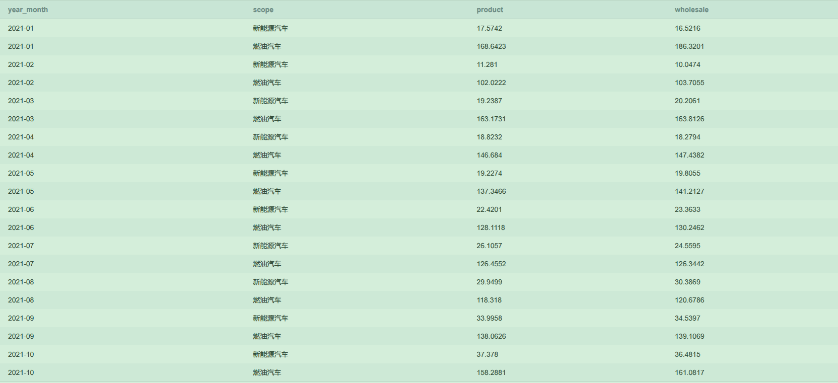 从2021年1月到2022年8月的中国狭义乘用车(区分新能源车和燃油车)逐月的生产量、批发量和销售量数据。