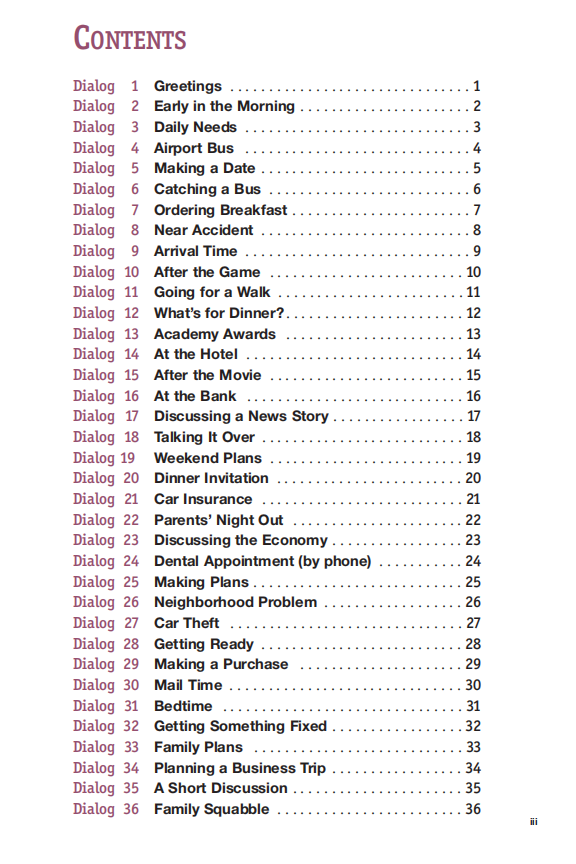 全书共36个生活话题。还原了如何结交新朋友、开车、日常家庭生活、学习以及进行商务旅行等场景,可以说是一本海外生活必不可少的 Survival Handbook。