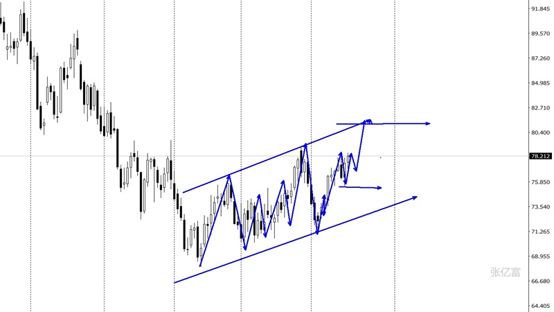 原油市场昨日开盘在77.75美元/桶,后行情先回落给出77.3美元/桶,后行情震荡拉升,日线最高触及到了79.1美元/桶,后行情整理,日线最终收线在了78.66美元/桶,后行情以一根下影线稍长于上影线的中阳线收线,而这样的形态收尾后,原油延续看涨中。4小时图在中轨附近整理启稳后放量摸高上轨,目前刚好点到上轨处。短线看能否直接突破此前高点79.30.突破才能打开空间,同时顶开上轨,不然还会陷入在高点之下整理蓄势。综合以上分析,张亿富认为:原油处于震荡上涨中,今日操作上考虑回撤布局多单为主,高空为辅,上方关注79.4-79.9美元阻力,下方关注78.0-77.0美元/桶支撑。