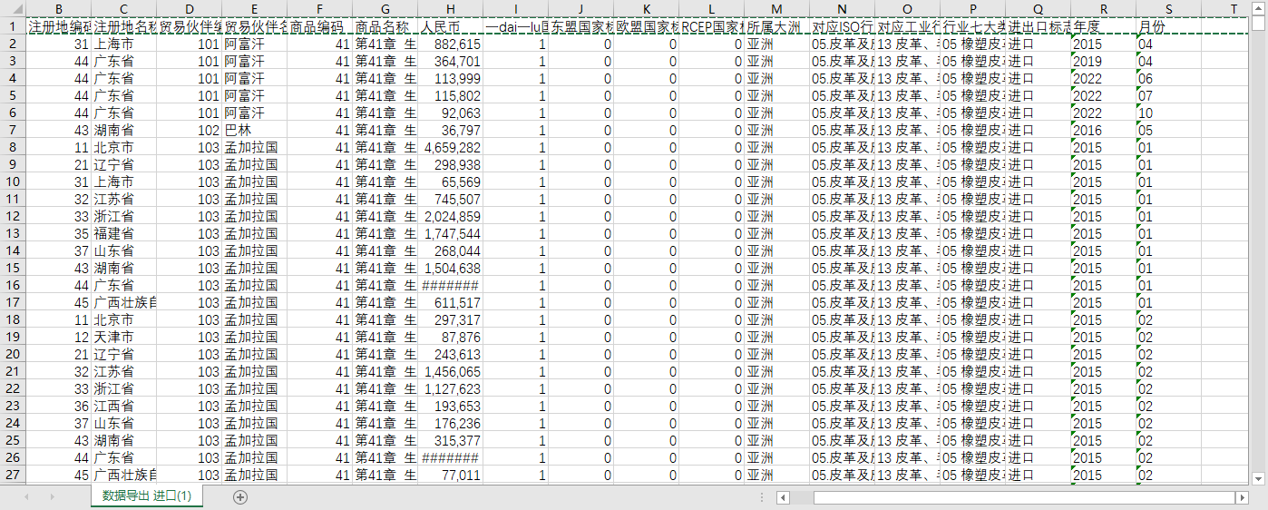 数据年月 注册地编码 注册地名称 贸易伙伴编码 贸易伙伴名称 商品编码 商品名称 人民币 一dai一lu国家标志 东盟国家标志 欧盟国家标志 RCEP国家标志 所属大洲 对应ISO行业分类 对应工业行业代码名称 行业七大类编码名称 进出口标志 年度 月份