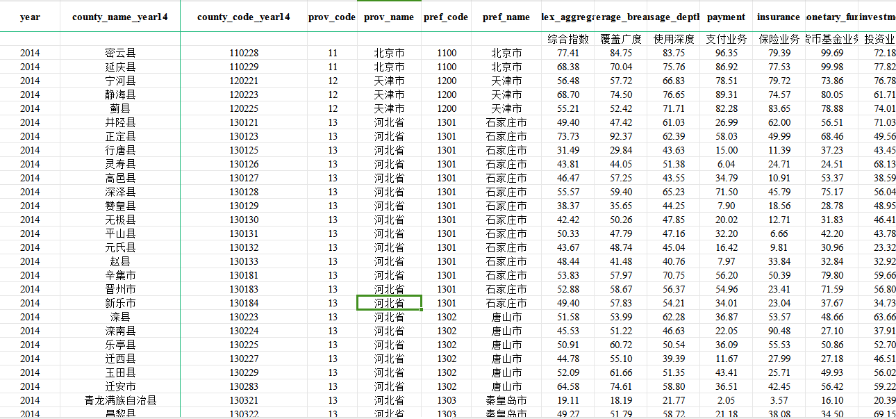 3、指标:覆盖广度、使用深度、支付业务、保险业务、货币基金业务、投资业务、信用业务、信贷业务、数字化程度