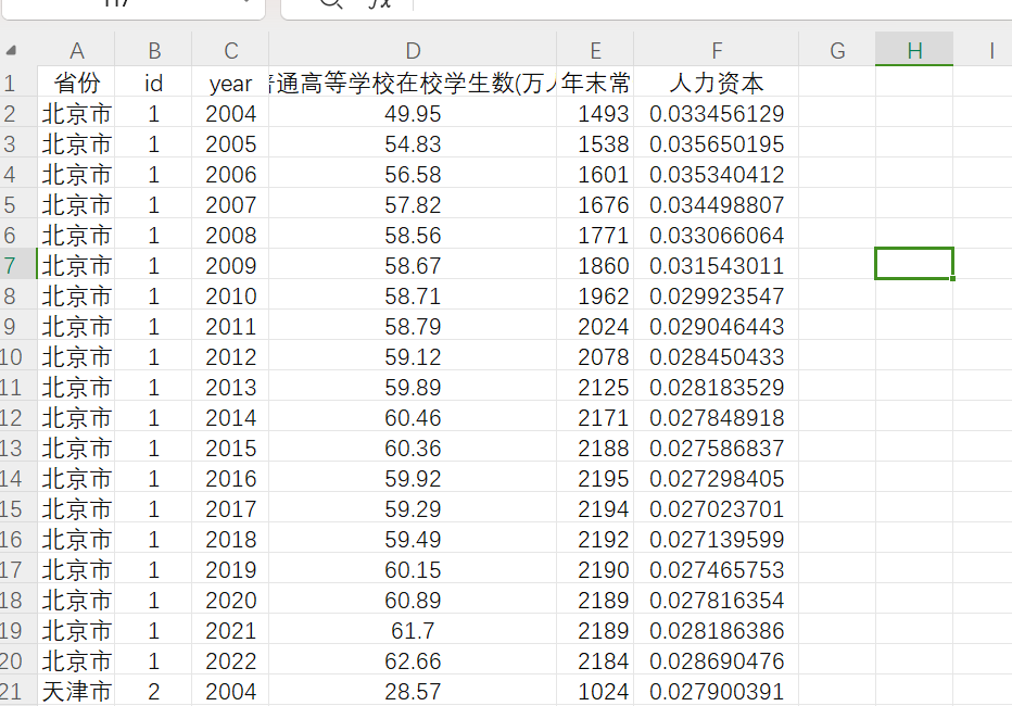 04-2022年31个(含西藏)省际面板数据—高等学校在校学生数(人力资本测算)使用:①高等学校在校学生数(万人)