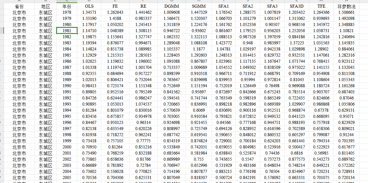 3、指标:省份、地区、年份、OLS、FE、RE、DGMM、SGMM、SFA1、SFA2、SFA3、SFA3D、TFE、非参数法
