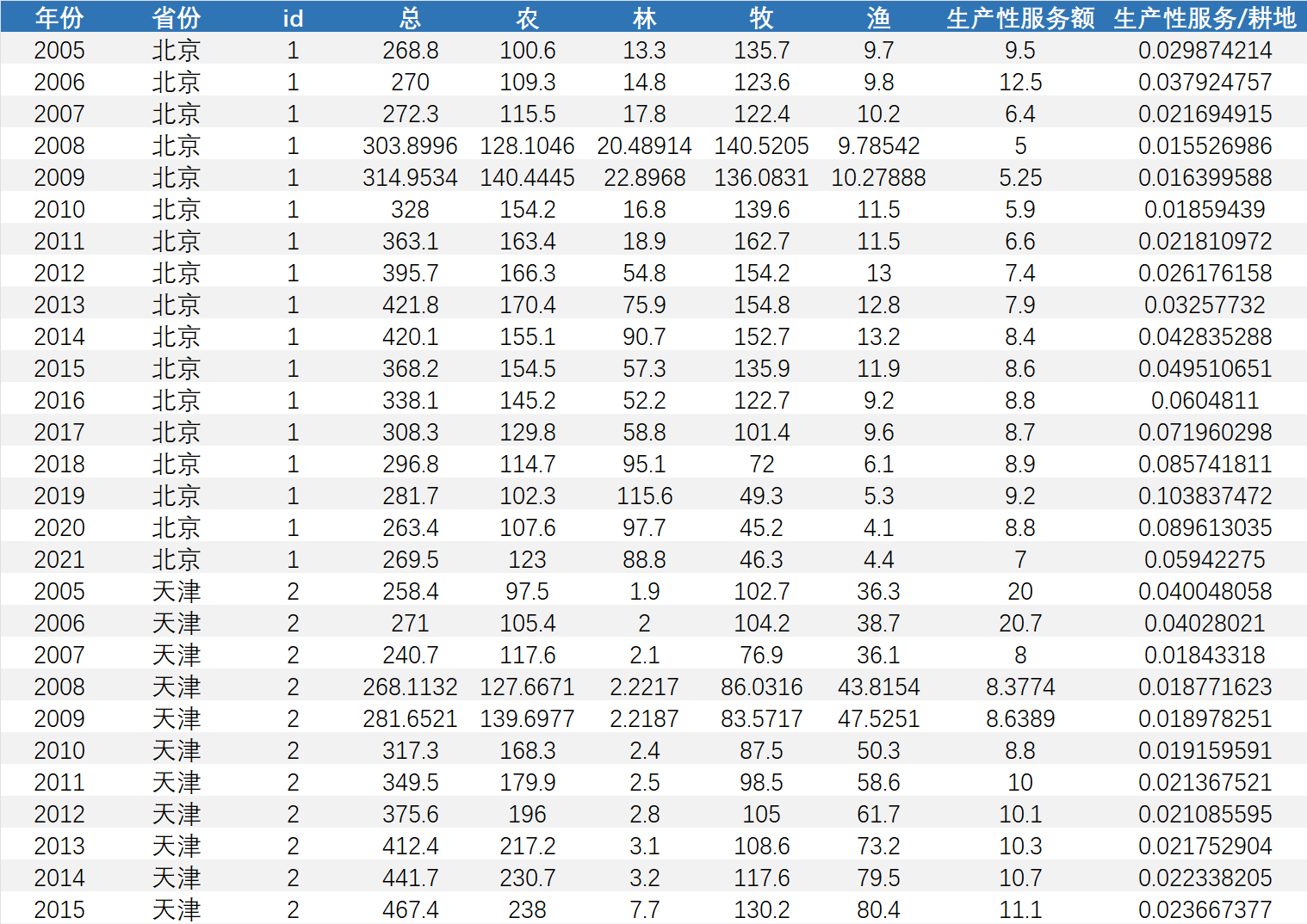 数据包括:农业总产值、农林牧渔分项总产值、生产性服务额总产值、生产性服务产值/耕地面积