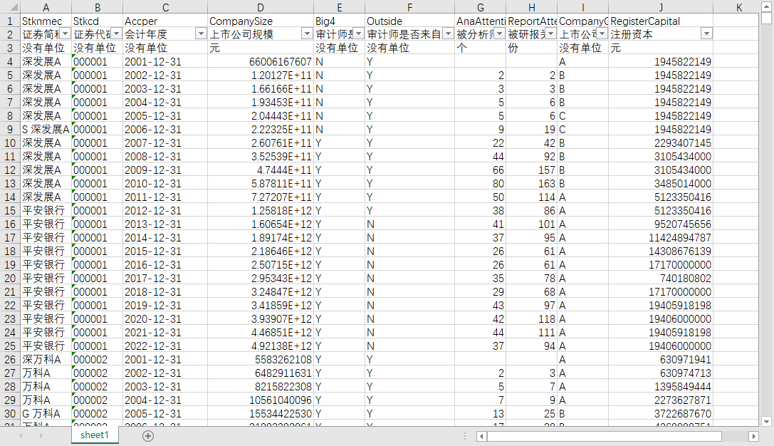 证券简称 证券代码 会计年度 上市公司规模 审计师是否来自四大会计师事务所 审计师是否来自境外会计师事务所 被分析师关注度 被研报关注度 上市公司透明度 注册资本