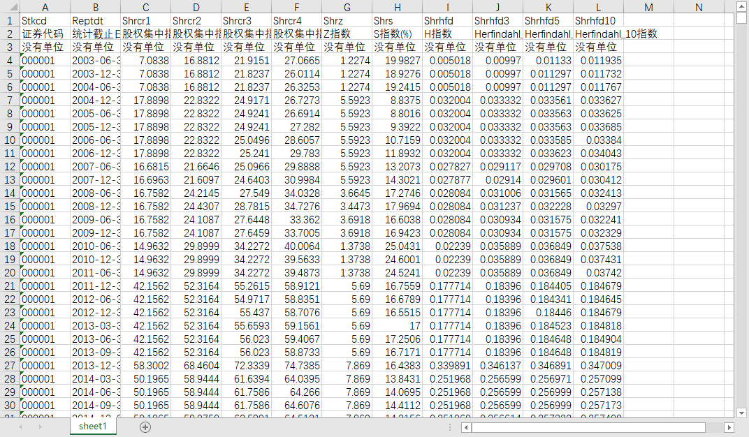 证券代码 统计截止日期 股权集中指标1(%) 股权集中指标2(%) 股权集中指标3(%) 股权集中指标4(%) Z指数 S指数(%) H指数 Herfindahl_3指数 Herfindahl_5指数 Herfindahl_10指数