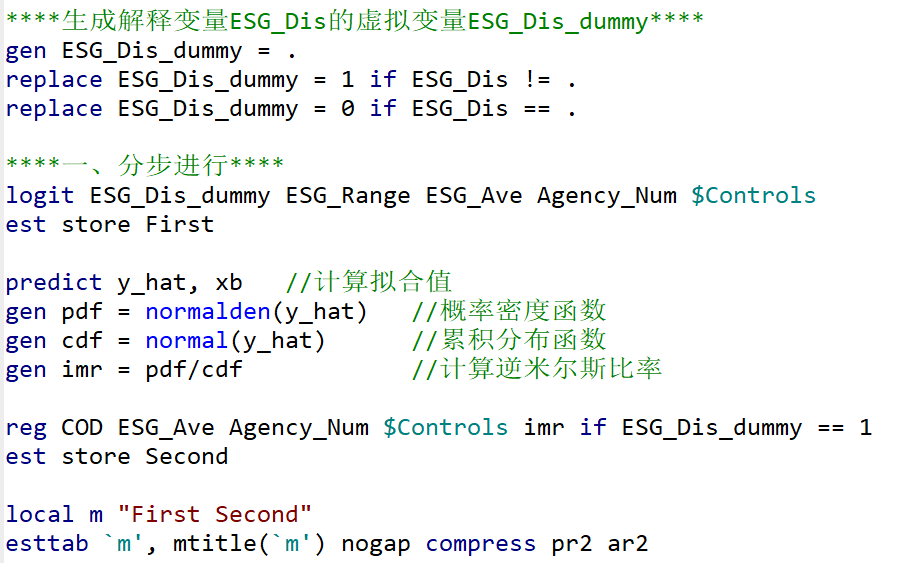 我自己尝试着写了一下stata命令,但是第二阶段回归的结果中没有x对y的系数。解释变量:ESG_Dis,生成的虚拟变量:ESG_Dis_dummy