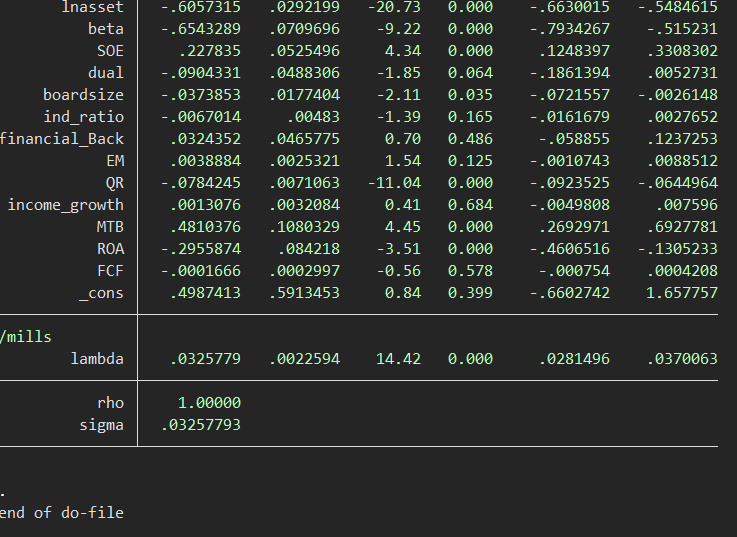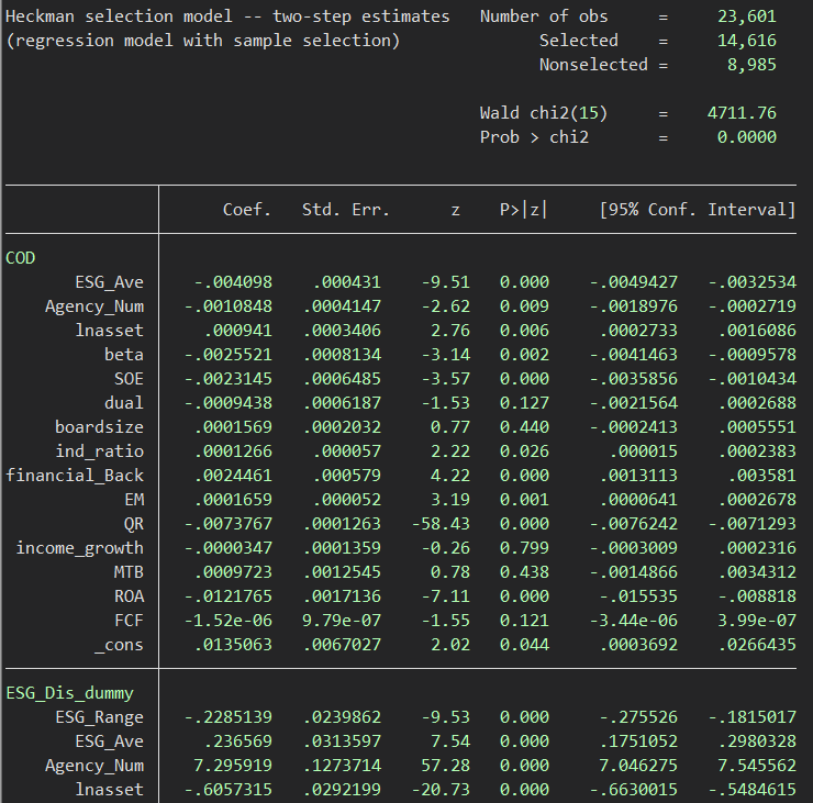 我参考一篇文献用Heckman两阶段模型做稳健性检验,解释变量是ESG评级分歧。文献中采用Heckman两阶段模型的原因是“鉴于ESG评级机构发布的ESG绩效评级结果并非包含中国A股的所有上市公司,对于未被纳入ESG评级的公司将不在回归样本中”,即将考虑到的是解释变量的缺失问题,将解释变量ESG分歧转换为虚拟变量进行probit回归。