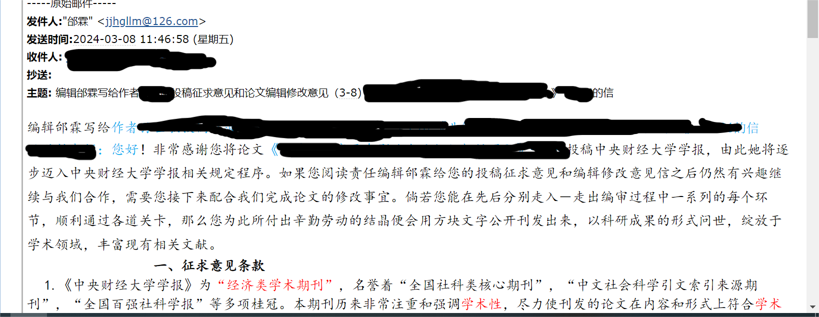 大块瓜皮猫 发表于 2024-3-11 14:55 求助投过中央财经大学学报的大佬,论文初审三个月后,收到这样一封自称编辑的信,邮件里没有实质性意见, ...