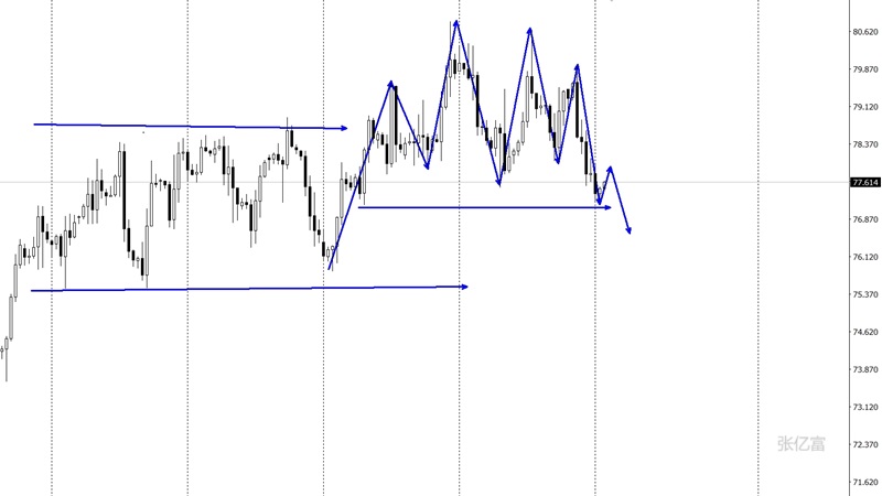 原油今日开盘在77.78美元/桶,原油先涨后跌,最高点触及77.963美元/桶承压,最低点触及77.234美元/桶一线企稳。日k线报收压制回落破底中阴,整体价格再度失守5日均线支撑,且日线级别呈现中阴反包格局,短线价格还有进一步下行回落预期,今日上方阻力关注上周五开跌口78.8-79区域,日内反抽依托此位置继续主空再看回落,下方短线支撑关注76.5-76.7附近;4小时图目前轻微受到压制,从上轨处三次承压跌至下轨,目前开盘在下轨附近,周初可能先走回落,关注一下75.80得与失,中轨作为强弱分界点,目前失守中轨先看短空。综合以上分析,张亿富认为:原油今日延续看跌思路,今日操作上考虑反弹做空为主,低多为辅,上方关注78.0-78.8美元阻力,下方关注77.0-76.0美元支撑。