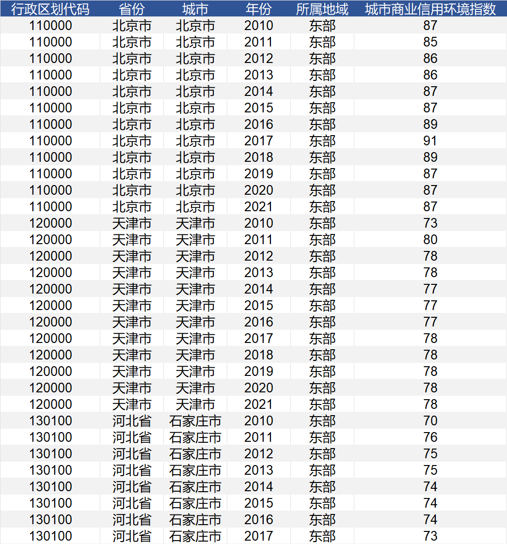 数据包括:行政区划代码 省份 城市 年份 所属地域 城市商业信用环境指数