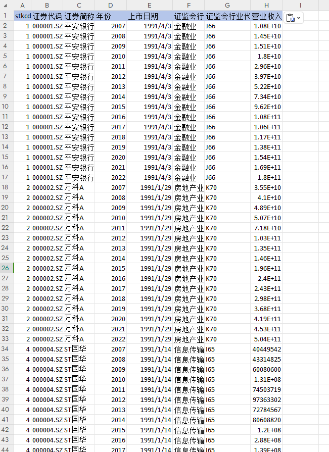 2007-2022A股上市公司营业收入和营业成本数据