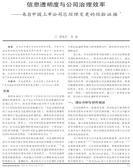 游家兴, 李斌. 信息透明度与公司治理效率——来自中国上市公司总经理变更的经验证据[J]. 南开管理评论, 2007(被引量:167)