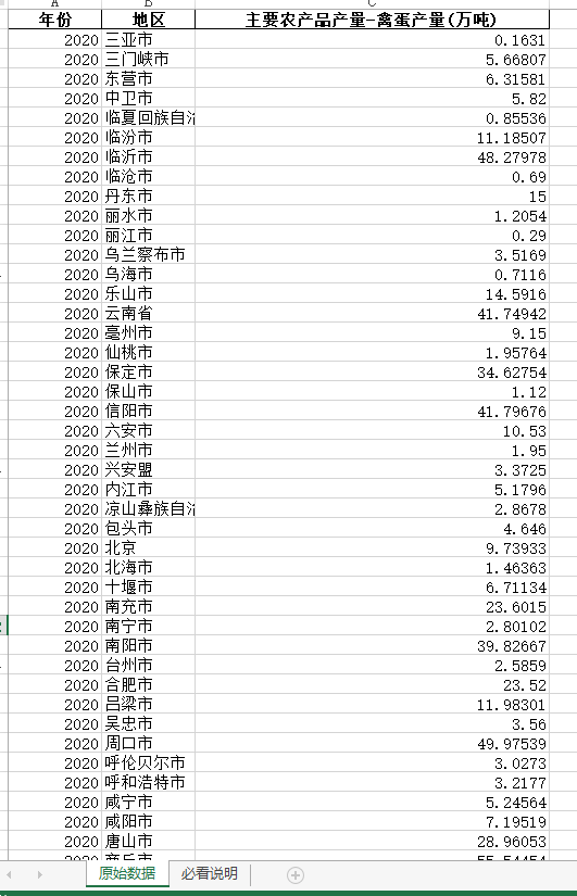 本数据为1999-2020年全国各城市禽蛋产量数据,可以反应各城市禽蛋产量波动特征,深入分析经济因素、自然因素及科技因素等对禽蛋产量波动的影响,有利于探索提高禽蛋综合生产能力,推动保障禽蛋产业的发展。