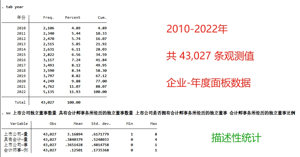 范围:2010 - 2022 年,共 43,027 条观测值,全部A股上市公司