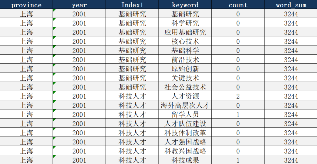 参考政府文本、文献,共统计18个关键词词频,含指标如下: