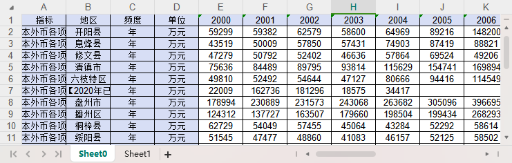 数据范围:各个省份的各个区县的金融机构本外币各项贷款余额、金融机构人民币各项贷款余额