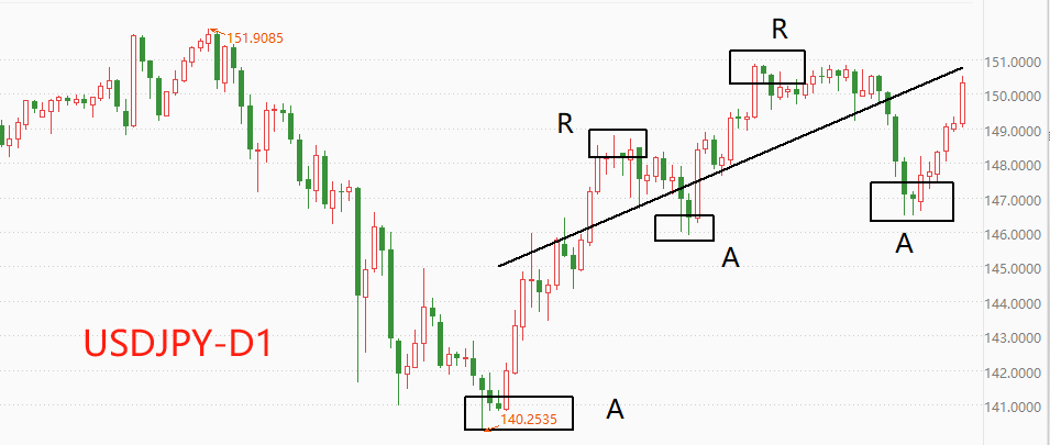 上图为USDJPY的日线走势图。技术角度看,USDJPY处于快速上涨波段当中,近六个交易日连续以阳线收盘,不宜看空。虽然日本央行宣布加息,但由于加息时点滞后于市场预期,所以对于日元币值的提振作用不明显,USDJPY不跌反涨。随着短期底分形支撑A的形成,USDJPY持续走高,目前市价已经来到黑色回归线附近。上方阻力位预计在阻力位R:150.88附近,由于150整数关口的存在,USDJPY突破R阻力的难度较大。