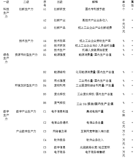 参考卢江、郭子昂等学者的做法,对新质生产力的评价建立在科技生产力、绿色生产力和数字生产力三个一级指标上。对于科技生产力,从创新生产力和技术生产力两个方面刻画;关于绿色生产力,从资源节约型生产力和环境友好型生产力两个角度进行测度;对于数字生产力,则从数字产业生产力和产业数字生产力两个层面进行考量。