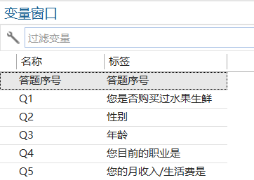 elabel var Q1"您是否购买过水果生鲜" Q2"性别" Q3"年龄" Q4"您目前的职业是" Q5"您的月收入/生活费是"