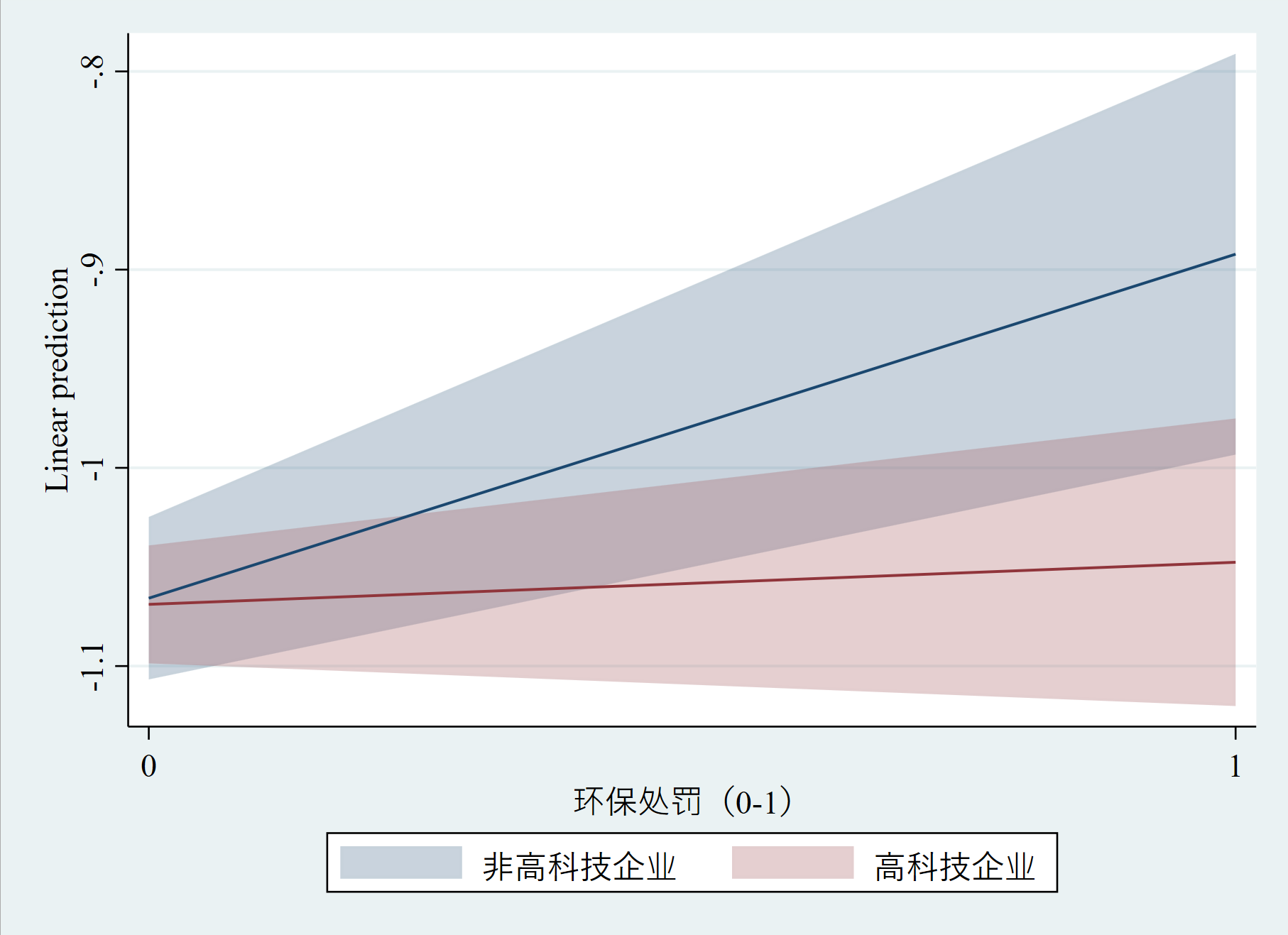 marginsplot, recast(line) recastci(rarea) ciopts(fcolor(%30) lcolor(%1)) title("") xtitle("环保处罚(0-1)") legend(order(1 "非高科技企业" 2 "高科技企业" ))