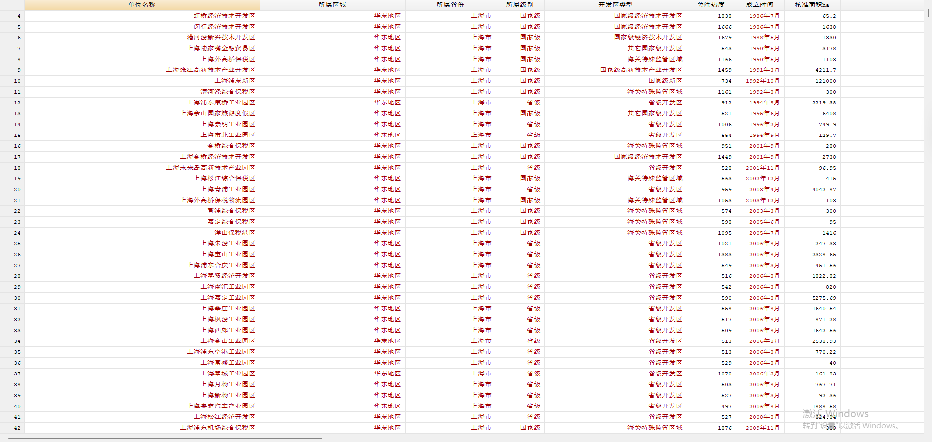 单位名称、所属区域 、所属省份、所属级别、开发区类型、 成立时间、year、 城市、核准面积、主导产业、地址、经度、纬度
