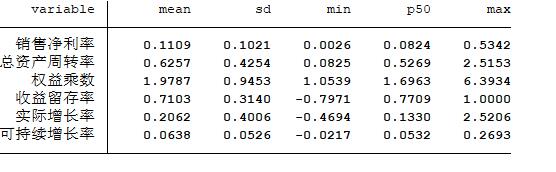 与参考文献相同,做了如下的处理:(1)剔除金融业公司;(2)剔除净资产和净利润为负的公司;(3)剔除变量缺失的样本
