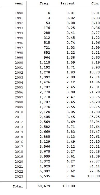 样本选择:全部A股1990-2023年数据(“日个股回报率文件”和“综合日市场回报率文件”在数据库中均是从1990-12-19开始,所以数据起点为1990年)