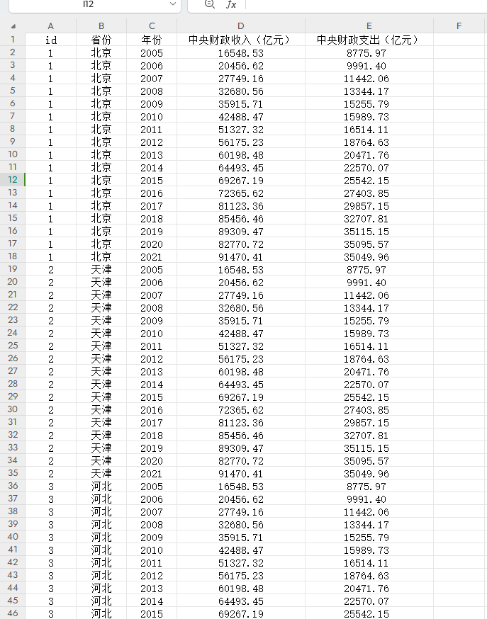 | id | 省份 | 年份 | 中央财政收入(亿元) | 中央财政支出(亿元) |