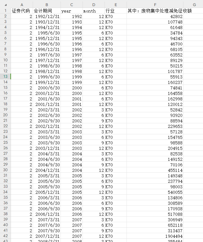 | 证券代码 | 会计期间 | year | month | 行业 | 其中:废物集中处理减免征收额 |