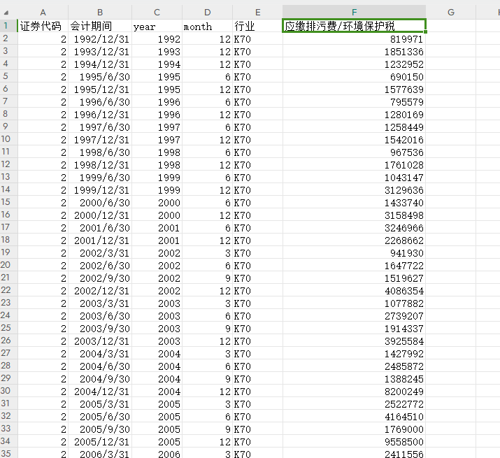| 证券代码 | 会计期间 | year | month | 行业 | 应缴排污费/环境保护税 |