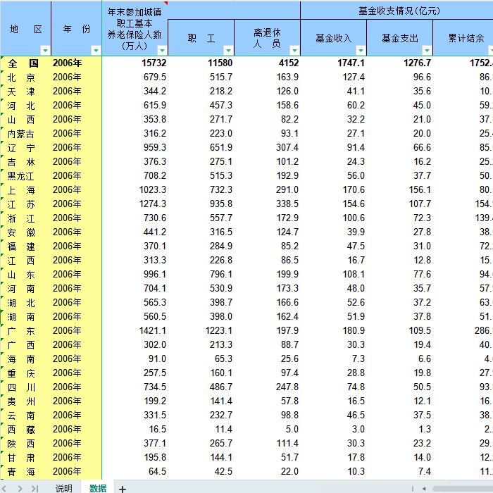 参保人数2006-2022年(缺失:2006年的天津、甘肃、新疆,2007年的天津、湖南、西藏、青海,2008年的湖南、西藏、青海,2009年的西藏、青海)
