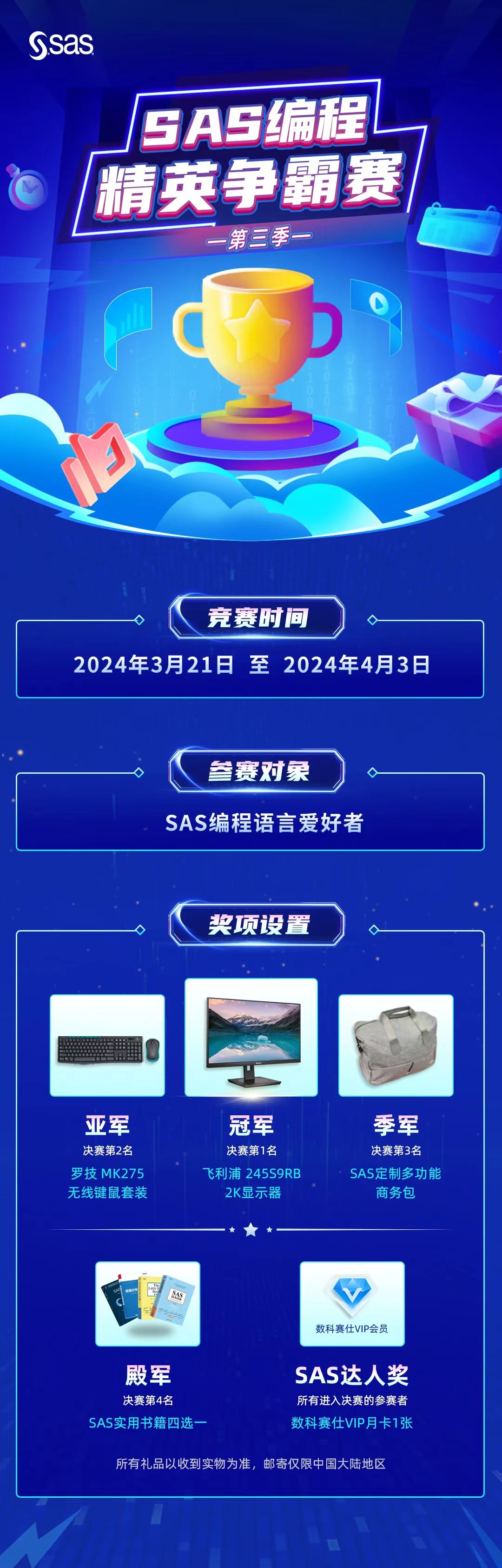 SAS编程知识是SAS程序员利用SAS软件分析问题、解决问题的重要能力。为了推进该能力的培养,提高SAS编程语言学习的氛围,同时促进SAS编程语言爱好者之间的交流,SAS中国Edu团队联合数科赛仕平台特举办“SAS编程精英争霸赛”,以回馈所有SAS编程语言爱好者对SAS的热爱,并鼓励大家在SAS编程语言学习之路上,永远保持一颗好奇的心,不畏挑战,勇攀高峰!