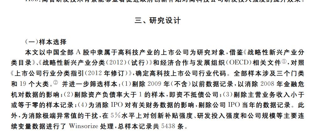 2.测算方式:参考C刊《财贸经济》彭红星(2017)老师研究的做法,以中国全部 A 股中隶属于高科技产业的上市公司为研究对象,借鉴《战略性新兴产业分
