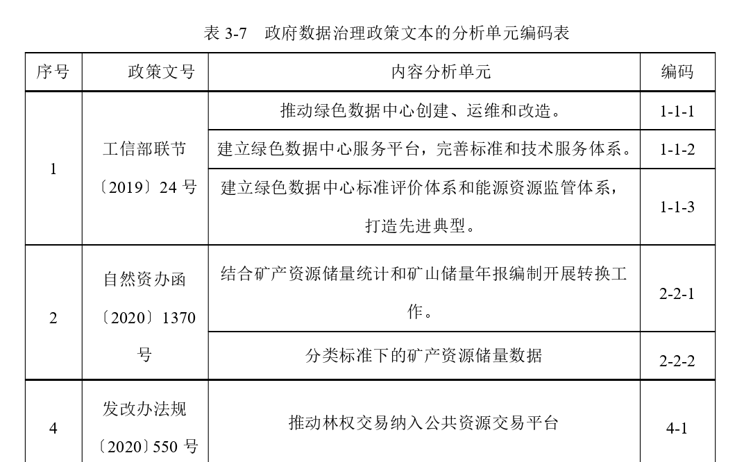 目前看了相关论文和期刊,大部分的操作是以政策条款为内容分析单元,并按照“政策序号-具体条款章节“进行编码,形成分析单元编码表,如下图所示。