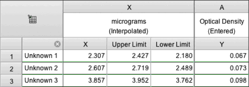在同一张表格上输入低于标准的未知数。在这些行中输入没有X值的Y值(下面的示例),或者在这些行中输入没有Y值的X值。可选地输入行标题来标记这些未知数。
