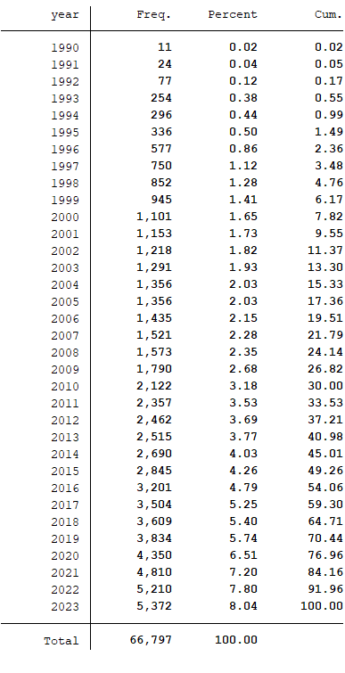 1990-2023年股价波动性(stata计算)