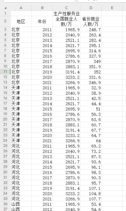 | 地区 | 年份 | 全国就业人数/万 | 省份就业人数/万 |